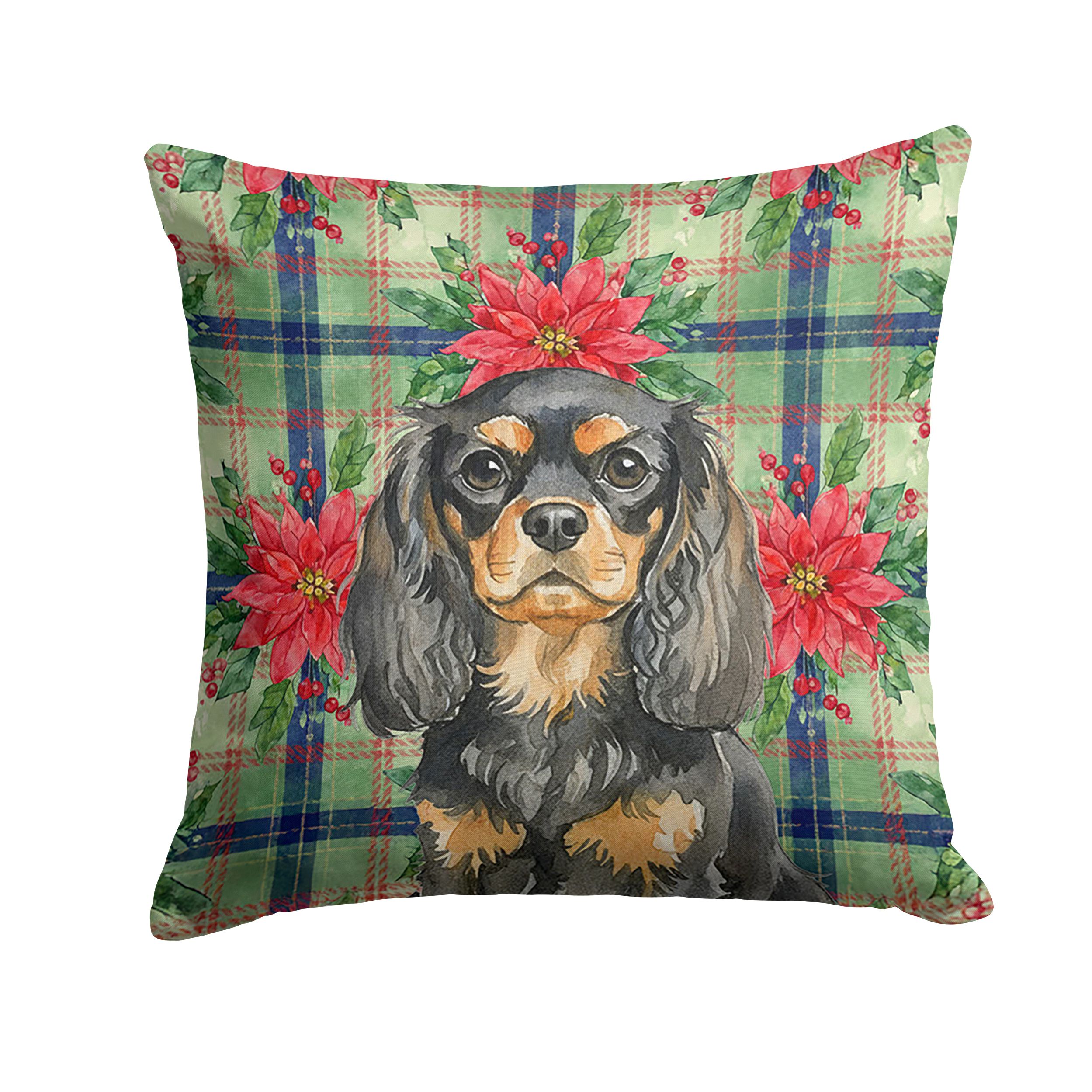 Black and Tan English Toy Spaniel Christmas PoinsettIas Throw Pillow Decorative Indoor Outdoor Accent Cushion for Couch, Bed or Patio, 18Hx18W