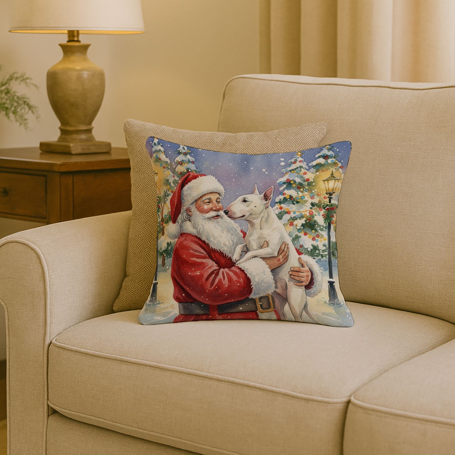 Throw Pillow featuring breed specific Bull Terrier artwork. Celebrate Christmas with this Christmas Pillow. Revitalize your outdoor or indoor living space with Caroline's Treasures 18x18 Fabric Decorative Pillow. With a generously sized dimension of approximately 18 inches by 18 inches, this pillow makes a comfortable and aesthetic addition to any seating area. Made from a unique, water-resistant material developed by Caroline's Treasures, the pillow sham is 100% polyester fabric that's durable and ready to weather any condition. Its vibrant, full-color artwork will not fade over time as it is dyed with color-fast dyes. Whether you place it on your patio furniture, porch, veranda, or indoor couch, its soft canvas fabric ensures a cozy experience. The pillow is handcrafted in the United States, featuring a sham created from three pieces of fabric and a polyester insert for enduring shape and overstuffed comfort. Despite being robustly built to endure the outdoors, it is as soft and snug as your favorite indoor cushions. Please note, as all our pillows are handmade, sizes may vary slightly, adding to the charm of this unique decorative item.