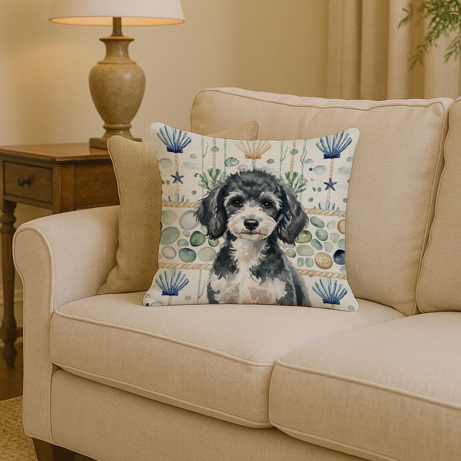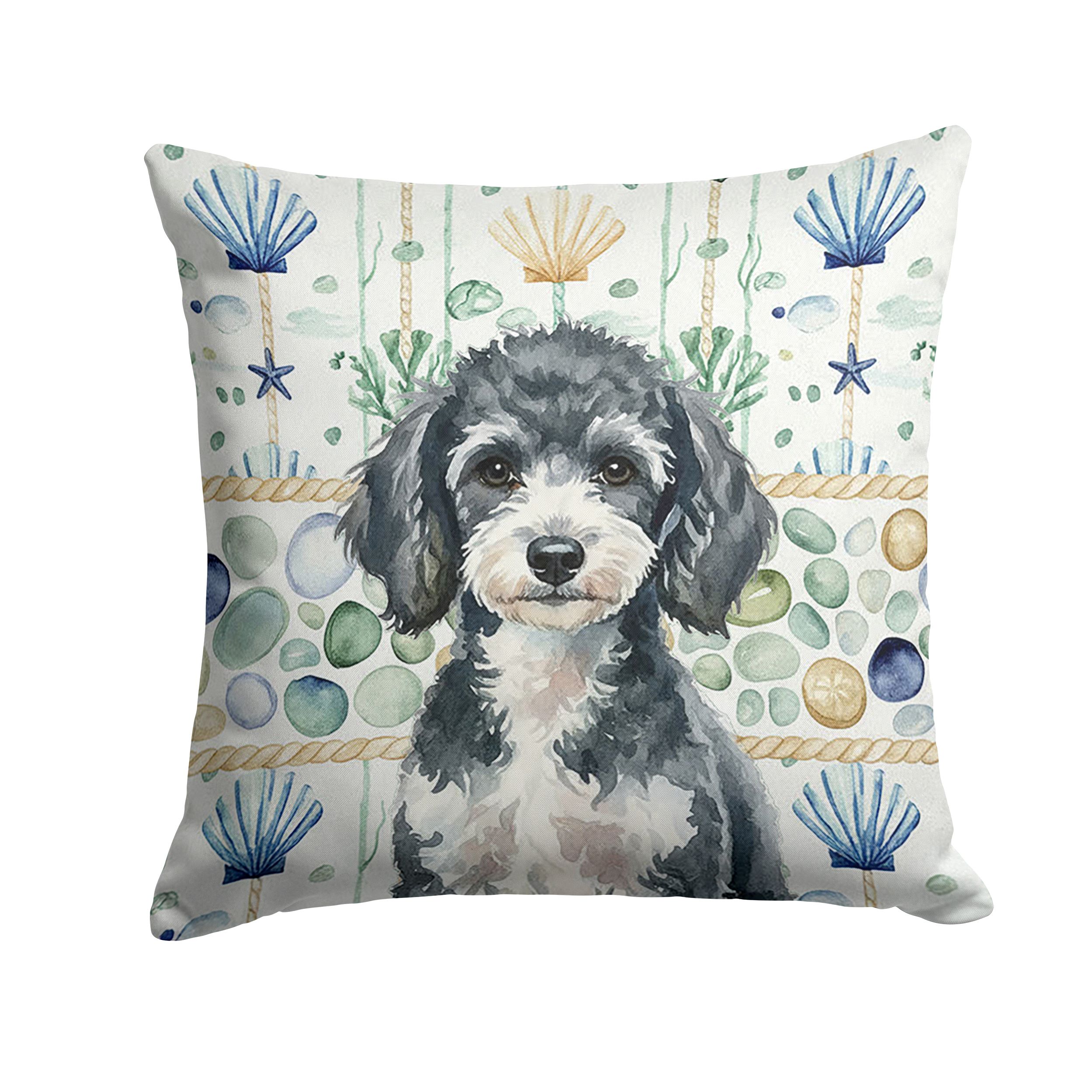 Home > Miniature Parti Poodle Coastal Sea Glass Throw Pillow Decorative Indoor Outdoor Accent Cushion for Couch, Bed or Patio, 14Hx14W