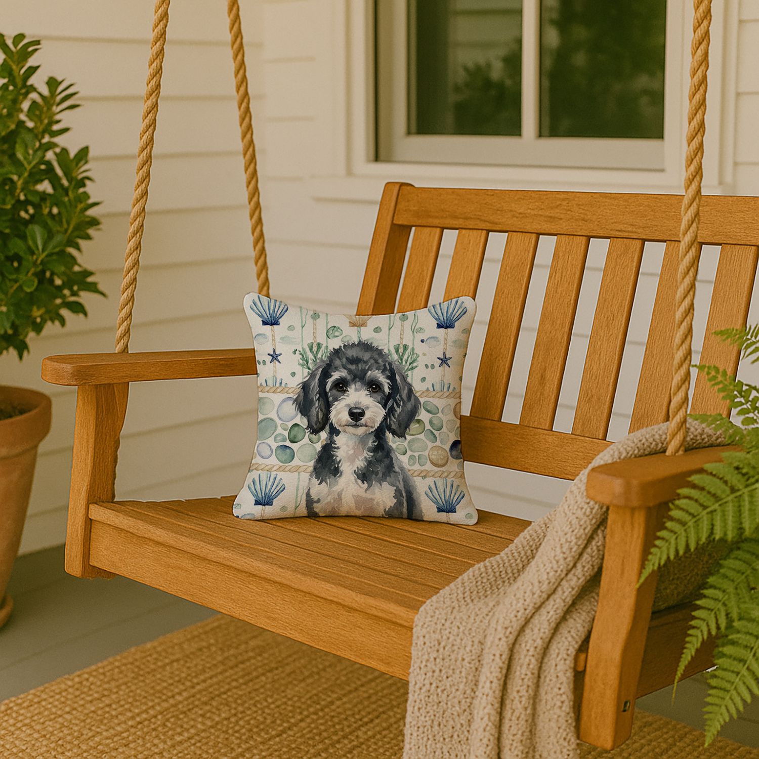 Miniature Parti Poodle Coastal Sea Glass Throw Pillow Decorative Indoor Outdoor Accent Cushion for Couch, Bed or Patio, 14Hx14W