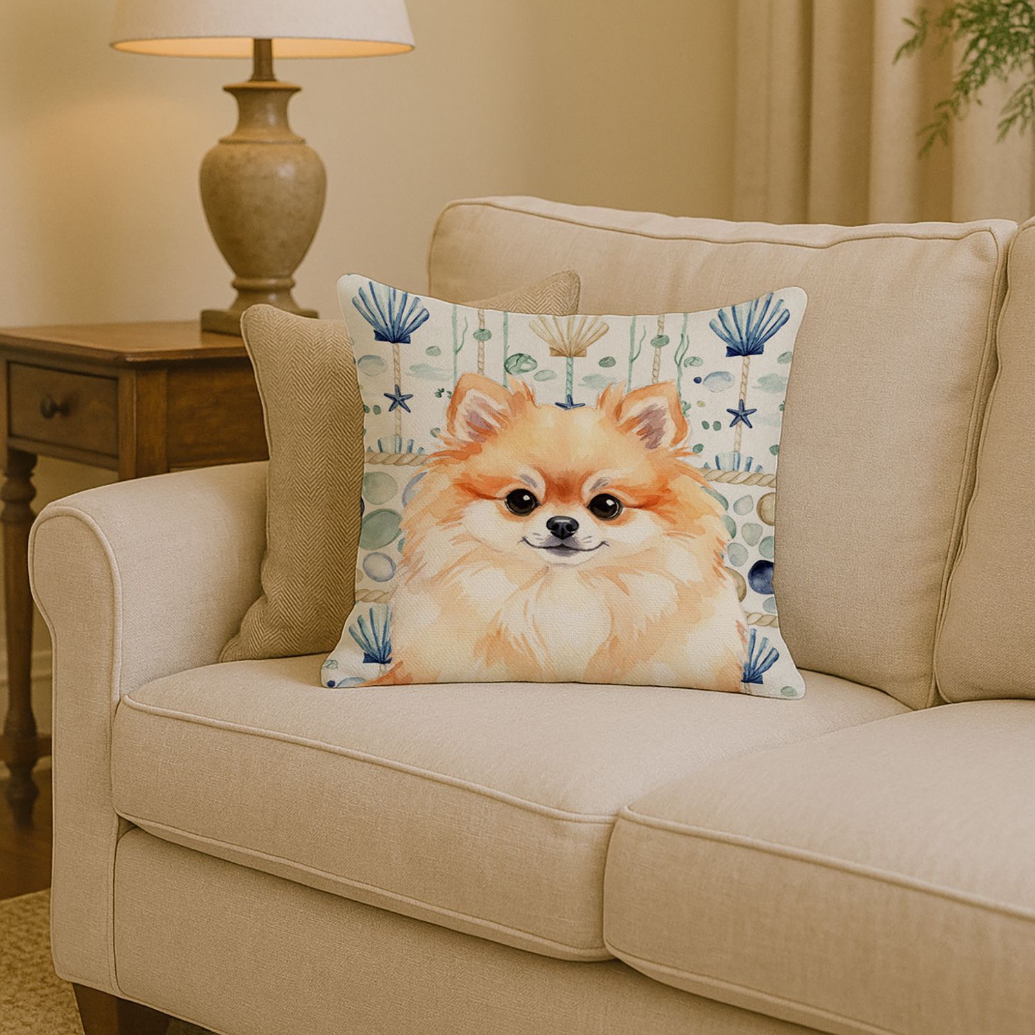 Pomeranian Coastal Sea Glass Throw Pillow Decorative Indoor Outdoor Accent Cushion for Couch, Bed or Patio, 14Hx14W