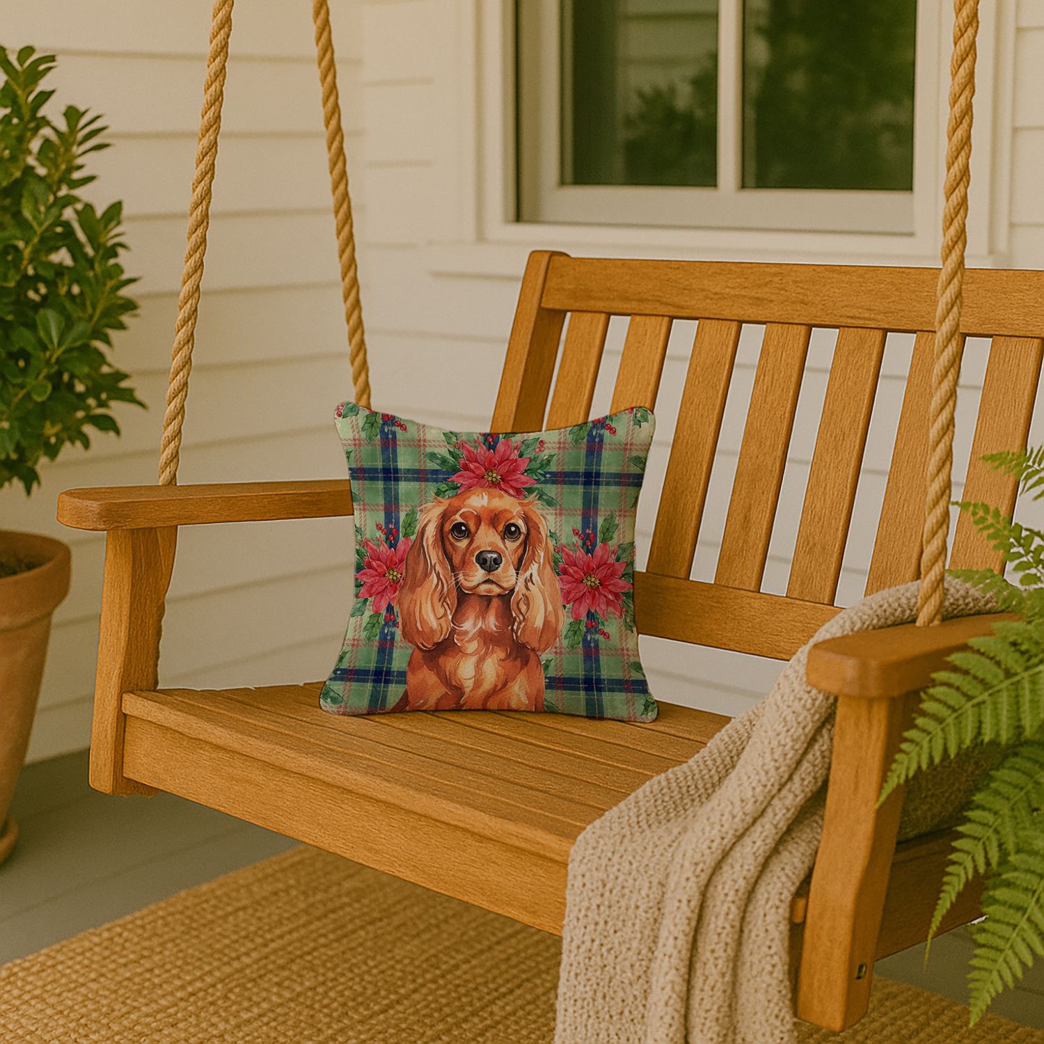 Home > Ruby English Toy Spaniel Christmas PoinsettIas Throw Pillow Decorative Indoor Outdoor Accent Cushion for Couch, Bed or Patio, 14Hx14W
