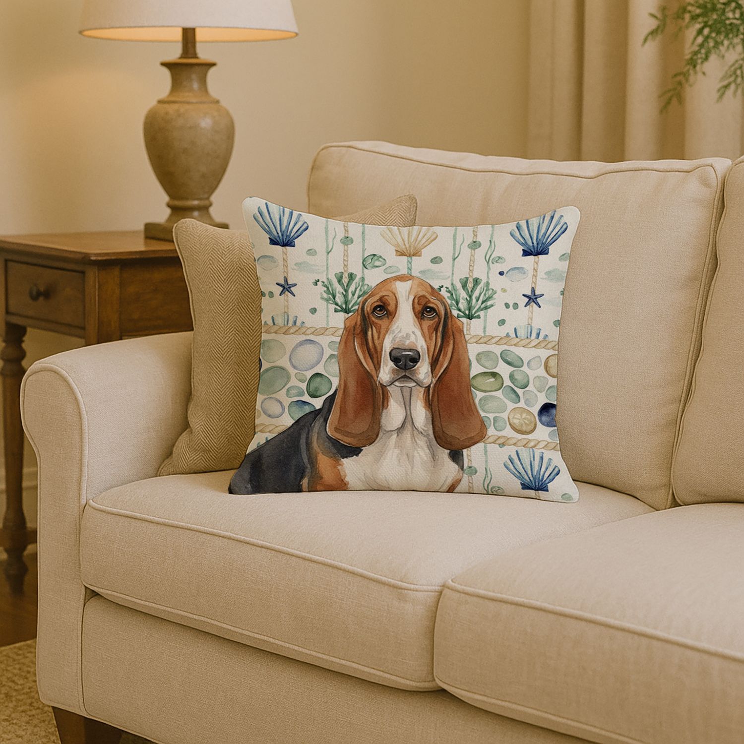 Home > Tricolor and White Basset Hound Coastal Sea Glass Throw Pillow Decorative Indoor Outdoor Accent Cushion for Couch, Bed or Patio, 14Hx14W